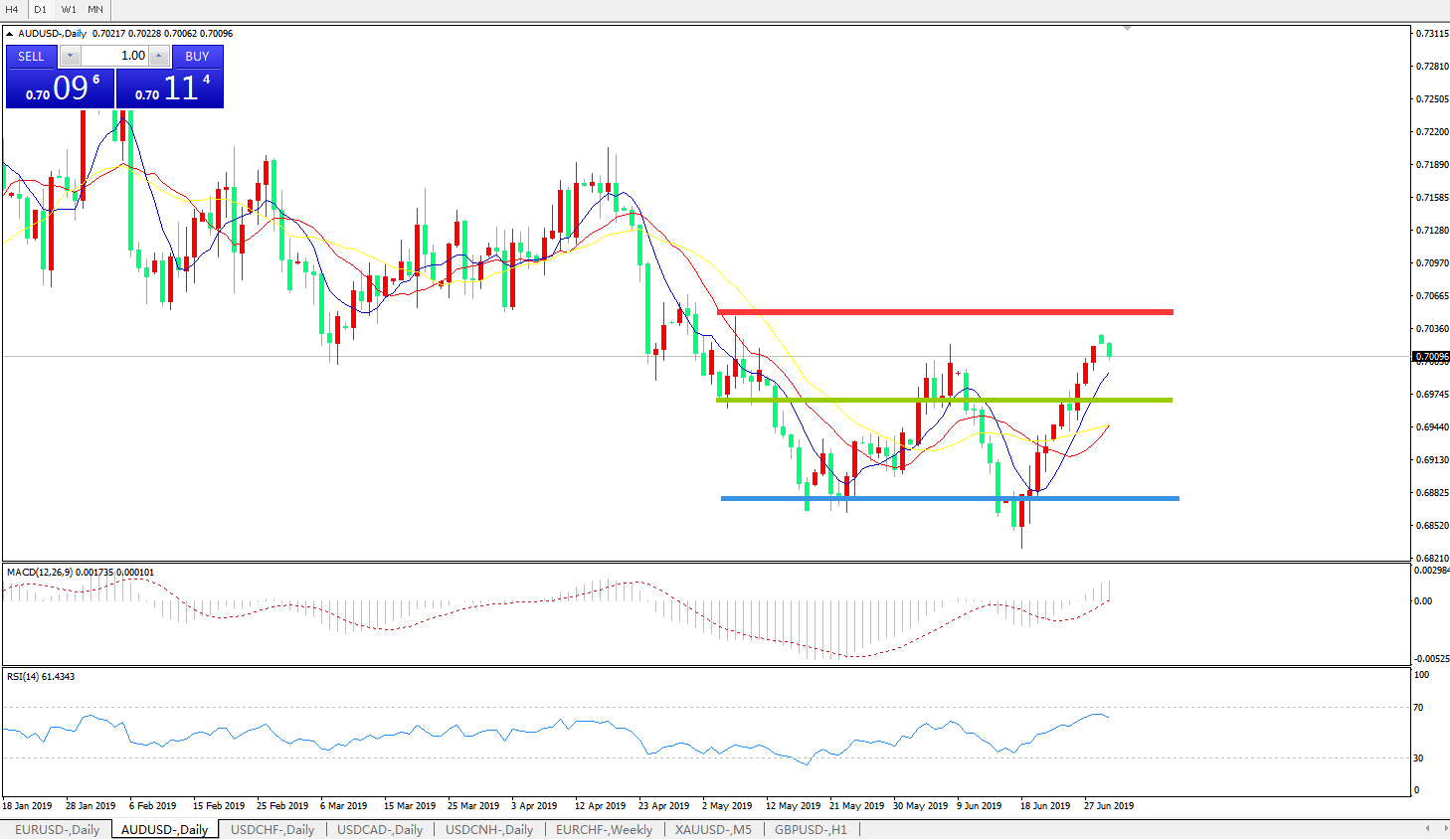 技术面简析:日图均线呈有序多头排列,汇价上行后有回落迹象但整体依旧强势,MACD逼近0轴且动能柱0轴上方放量,RSI连续反弹后略显疲态,汇价站上0.70关口,短线料将继续上行,重点关注明日澳洲联储利率决议。