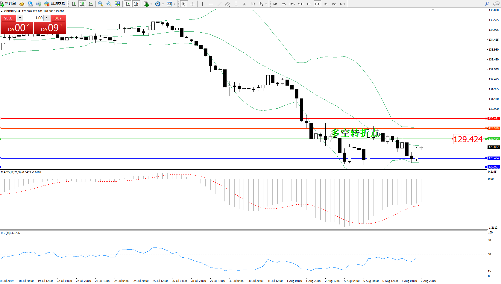 交易策略:129.424下方看跌,目标128.434、127.991