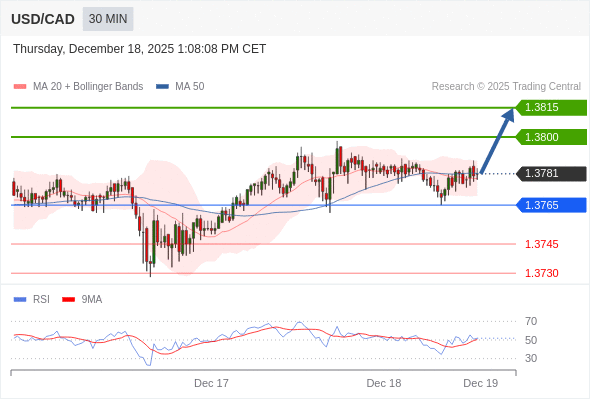 在 1.3765 之上,看涨,目标价位为 1.3800 ,然后为 1.3815 。