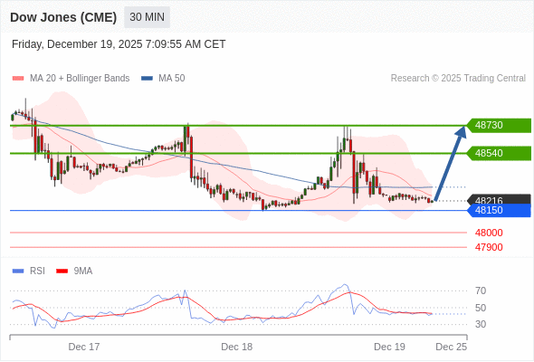 在 48150 之上,看涨,目标价位为 48540 ,然后为 48730 。