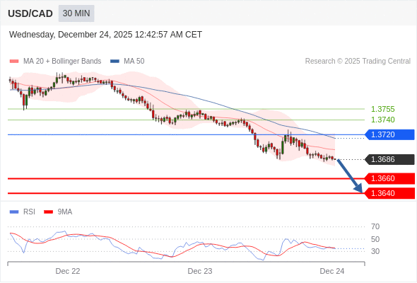 美元/加元 当日内: 期待1.3640。