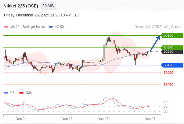 在 50430 之上,看涨,目标价位为 50730 ,然后为 50980 。