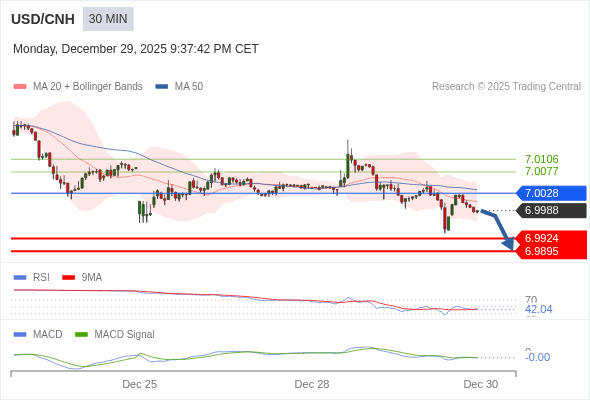 美元/人民币 当日内 : 看跌,在 7.0028 之下。