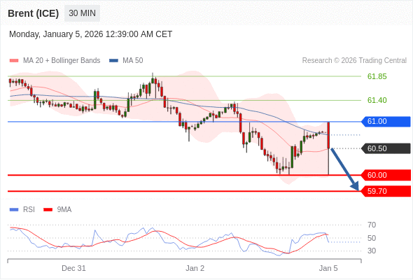 布伦特原油 (ICE) (H6) 当日内: 短期关键阻力位在61.00。