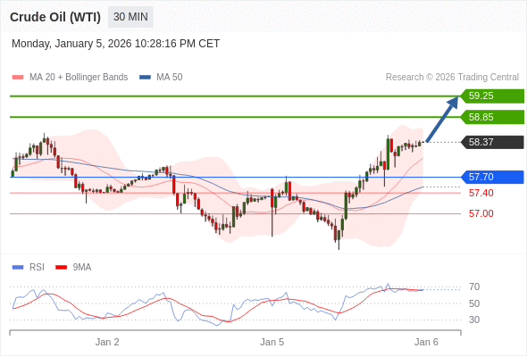 在 57.70 之上,看涨,目标价位为 58.85 ,然后为 59.25 。