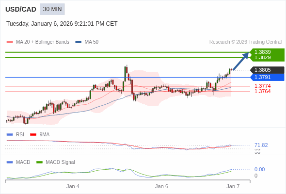 美元/加元 当日内 : 看涨,当 1.3791 为支撑位。