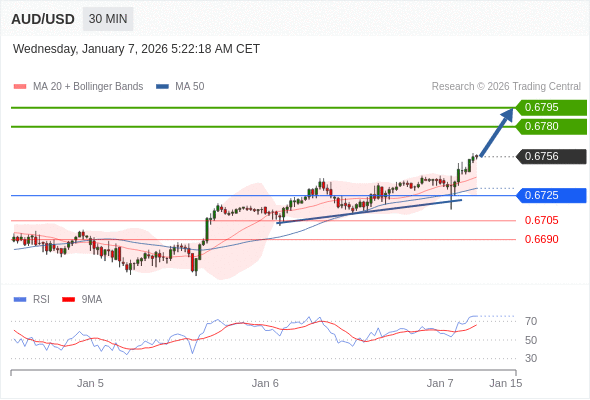 在 0.6725 之上,看涨,目标价位为 0.6780 ,然后为 0.6795 。