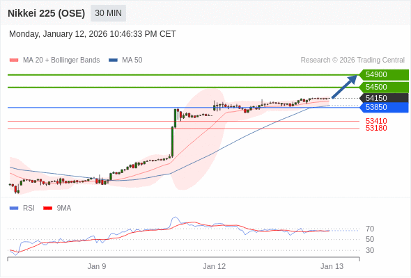 日经225股指期货 (OSE) 当日内: 在53850之上,看涨。