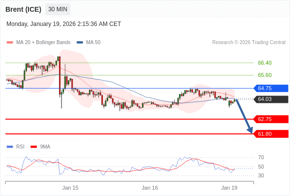 布伦特原油 (ICE) (H6) 当日内: 短期关键阻力位在64.75。