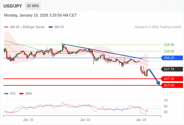 交易策略: 在 158.25 之下,看跌,目标价位为 157.30 ,然后为 157.00 。