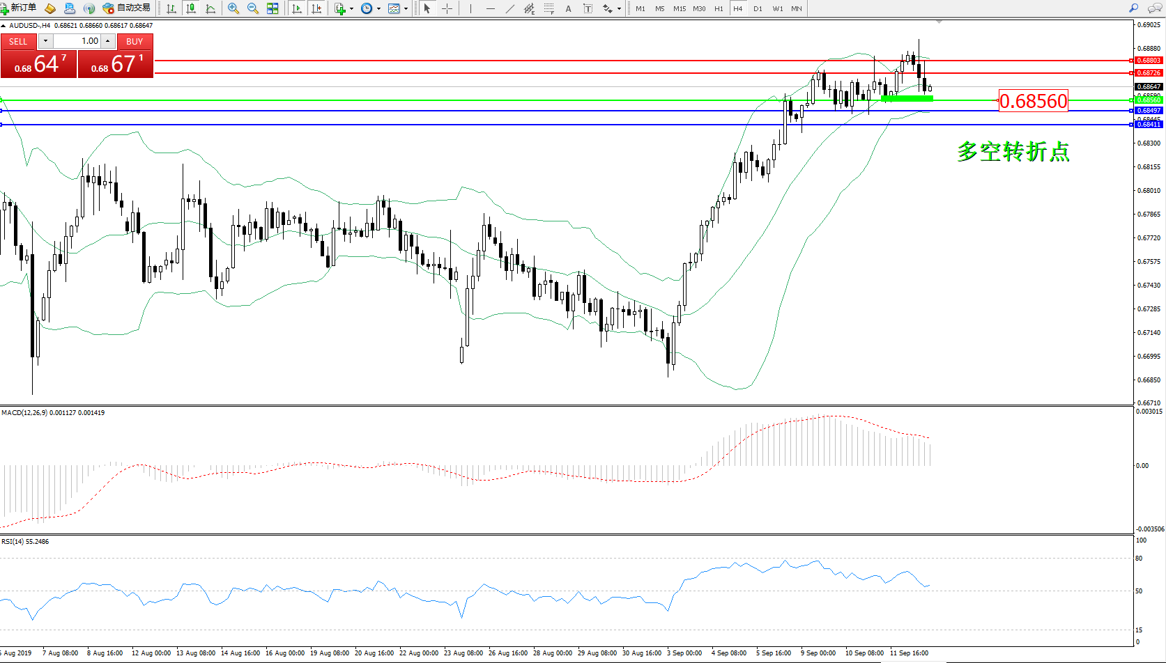备选策略:0.68560下方看跌,目标0.68497、0.68411