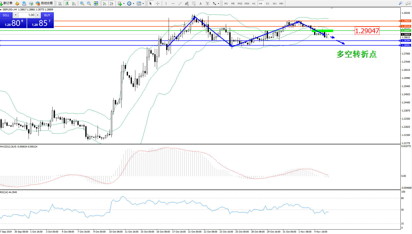 交易策略:1.29047下方看跌,目标1.28394、1.28091