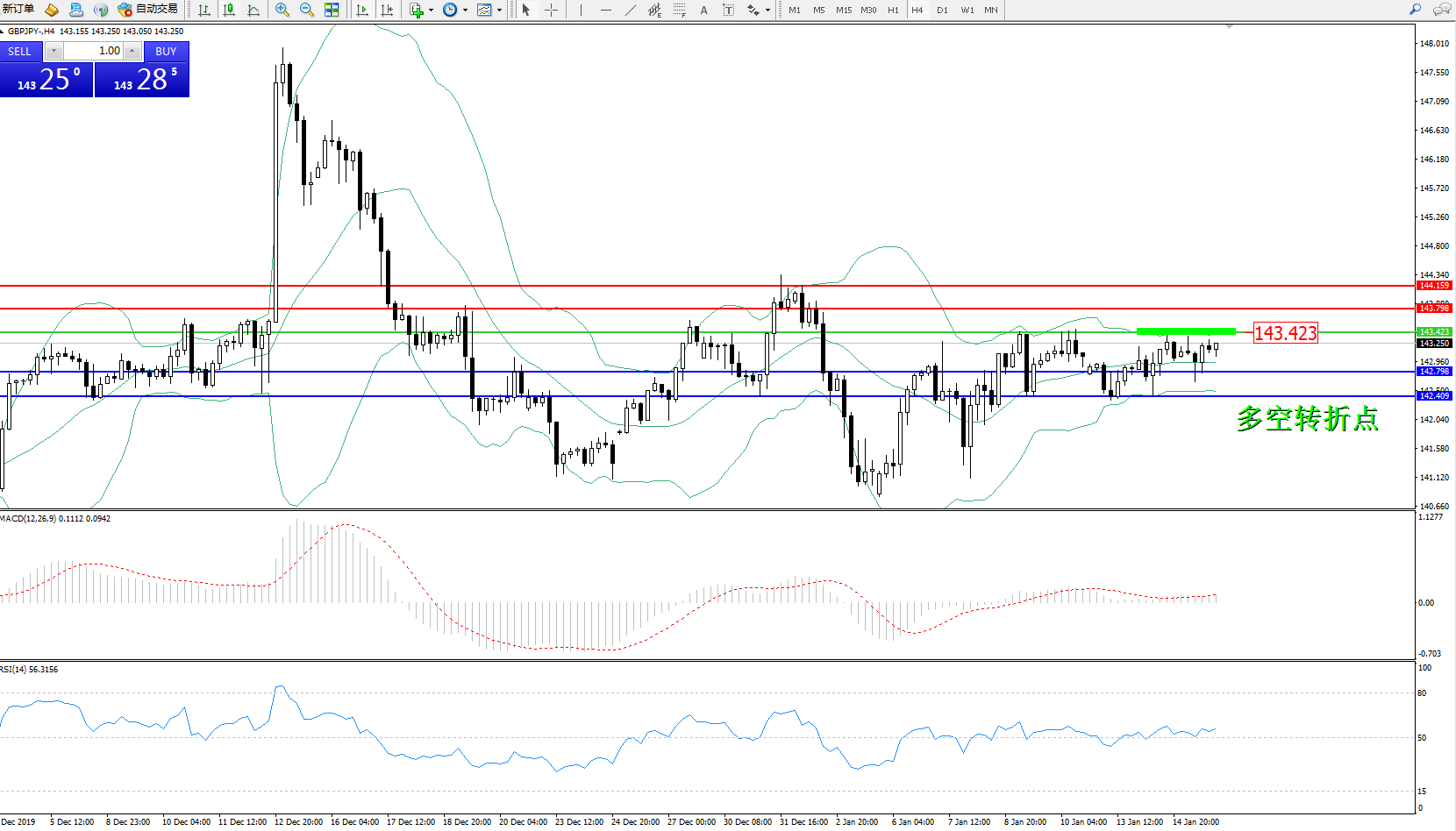 备选策略:143.423上方看涨,目标143.798、144.159