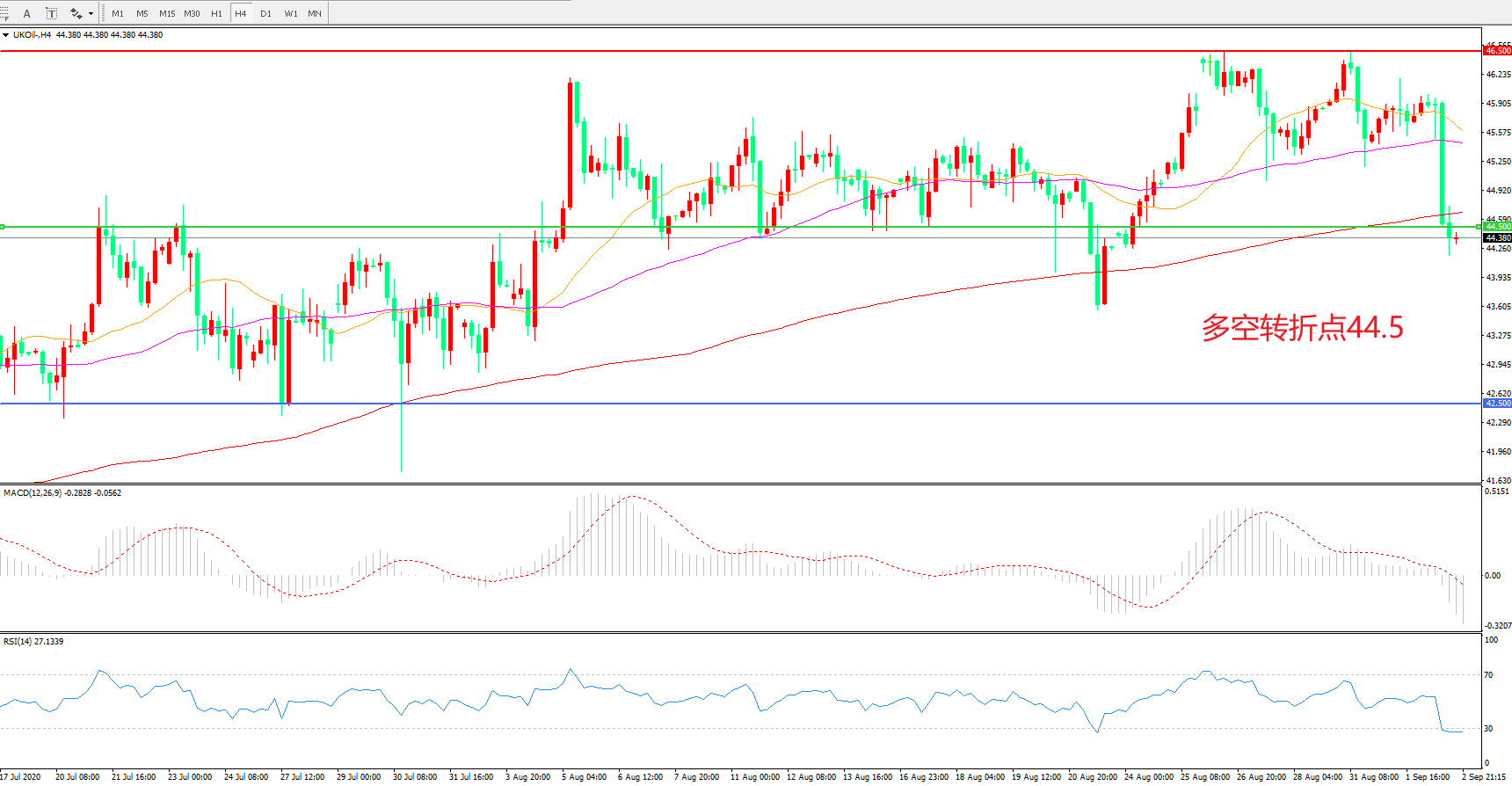 交易策略:   在44.50之下看跌,目标42.50       40.00