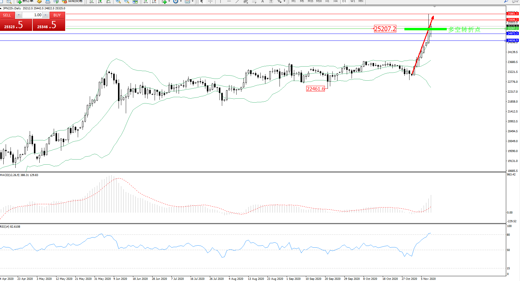 日经225指数11月10日(周二)收盘上涨63.16点,涨幅0.25%,报24903.00点。市场仍在继续交易拜登胜选和疫苗好消息,不过,美国联邦总务署(GSA)仍然没有宣布拜登为总统选举的获胜者,而辉瑞的疫苗初步研究结果也引发对安全性和持久性的质疑。但眼下市场关注焦点却重返对于美国大选选情的顾虑,这令美元指数继续承压,也与美国朝野恶斗之下财政援助协议年内达成料无望的前景构成了鲜明反差,日本政府将编制额外预算,进一步通过财政手段刺激经济复苏的行动,日本首相菅义伟表示,正在以最高程度的谨慎来应对新型冠状病毒疫情。日本政府将编制额外预算,进一步通过财政手段刺激经济复苏的行动,也与美国朝野恶斗之下财政援助协议年内达成料无望的前景构成了鲜明反差,这意味着日本央行短期内不会再有更强力的宽松措施祭出,这和美联储仍在随时严阵以待准备出面“救火”的状况也构成了鲜明反差。