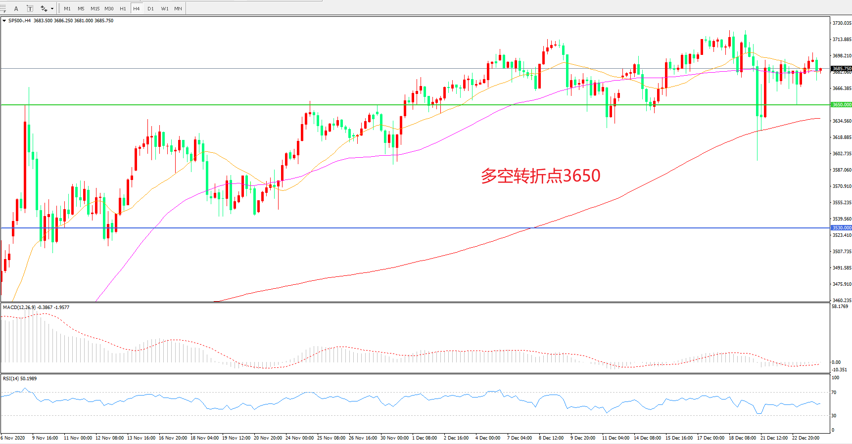 4小时图看,标普500延续高位震荡,整体波幅不大,下方支撑较为明显,均线系统逐渐走平,3680成为运行中枢,MACD红柱缩短,RSI指标走平,日内延续震荡概率较大。