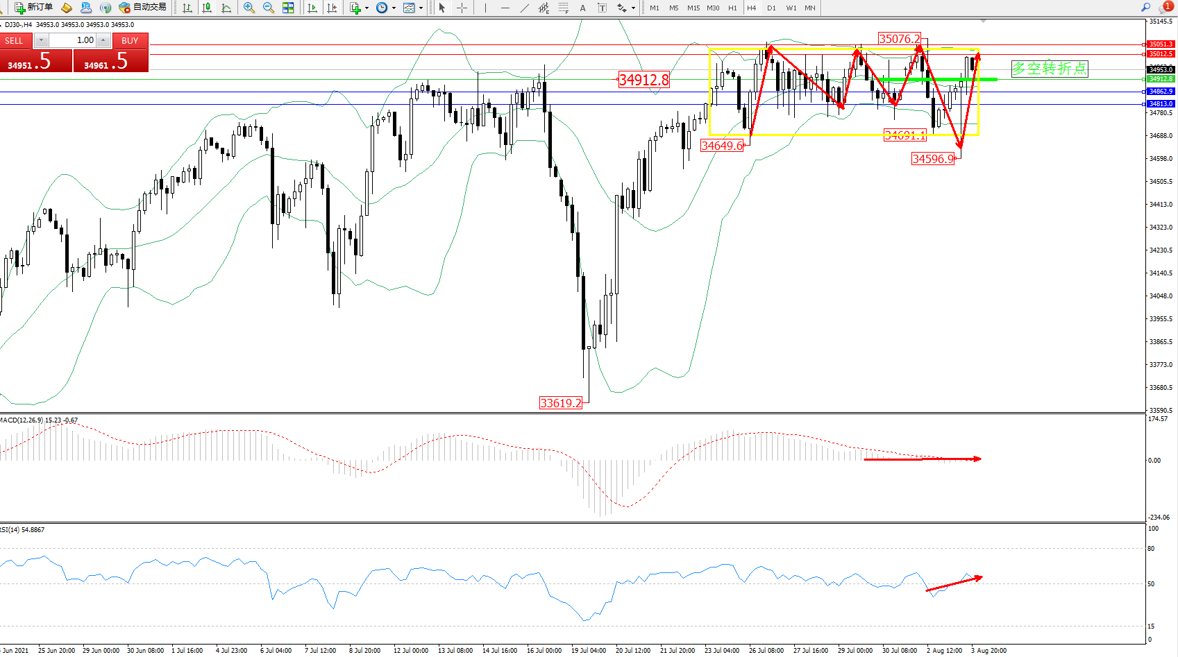 交易策略:34912上方看涨,目标35012、35051