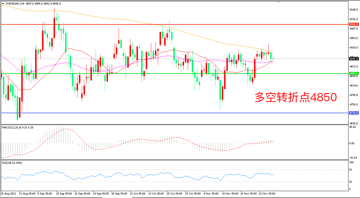 周四(11月25日),A股三大指数全天维持窄幅震荡态势,最终集体小幅收跌,沪深300冲高回落,收报4895.4点。两市合计成交11132亿元,北向资金净流超10亿元。在无增量资金入场之前,沪深300缺乏持续上涨的动力,而从市场情况来看当下也没有大的利空,因此,横向震荡整理将是沪深300短期主要运行特征。