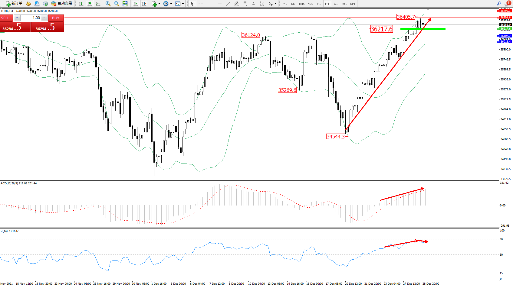 道琼斯指数DJ30——4小时K线图显示: