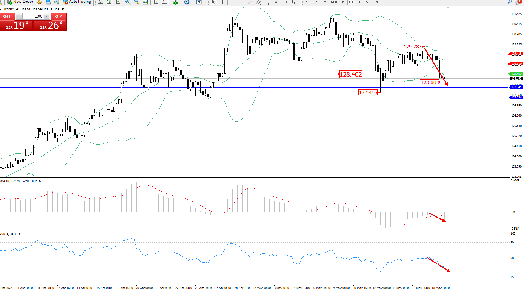 交易策略:128.402下方看跌,目标127.741、127.234