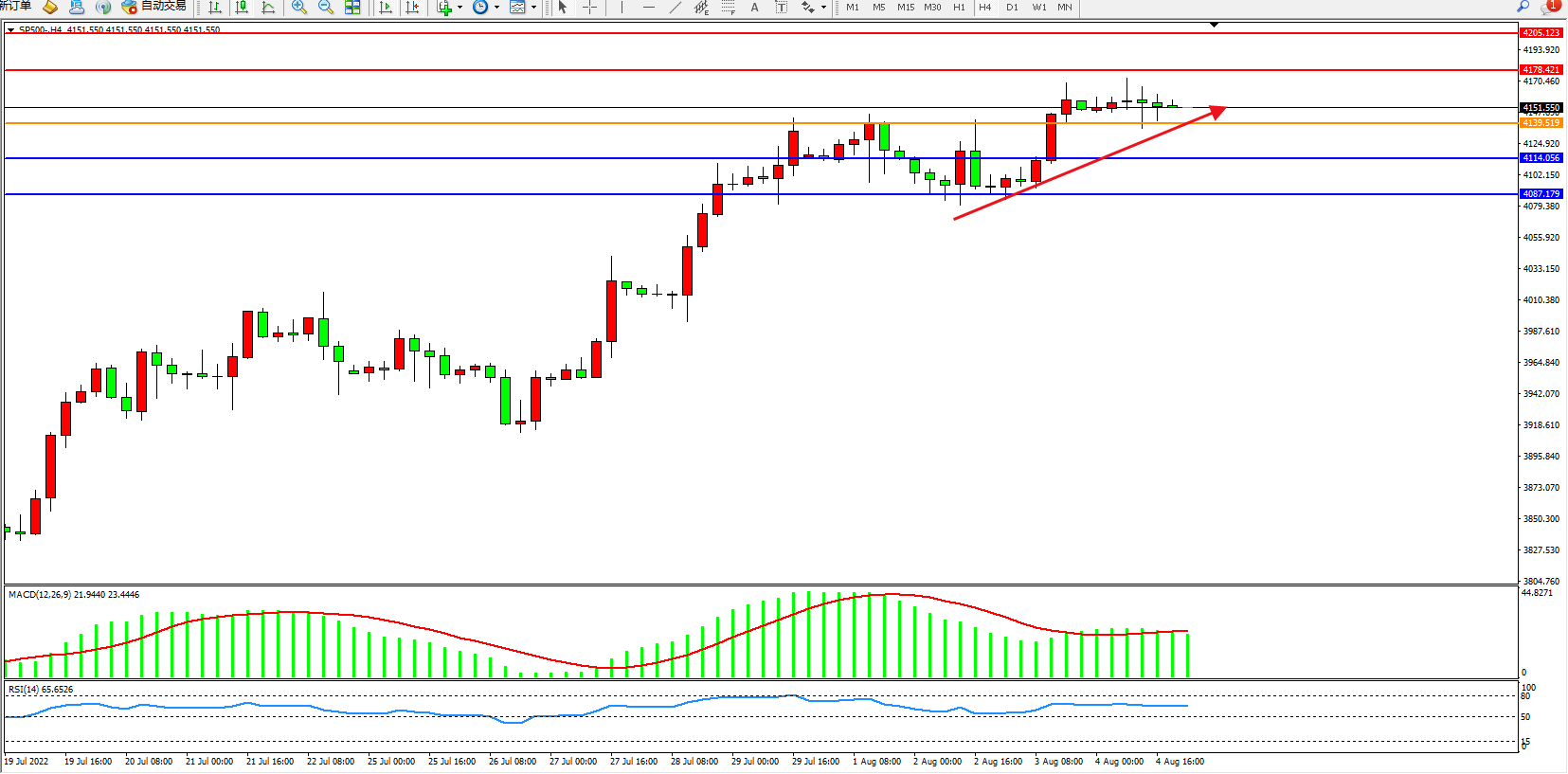 标普SP500——4小时K线图显示: