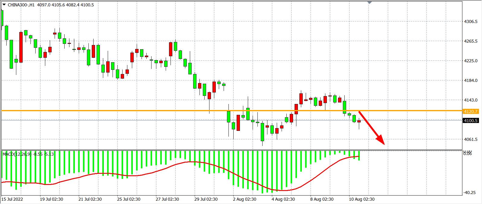 1小时图看,沪深300下破4120,支撑已转化为阻力,同时MACD于零轴之下量能放大,显示趋势偏向空头,日内关注阻力4120,在该位之下看回调4050-4000