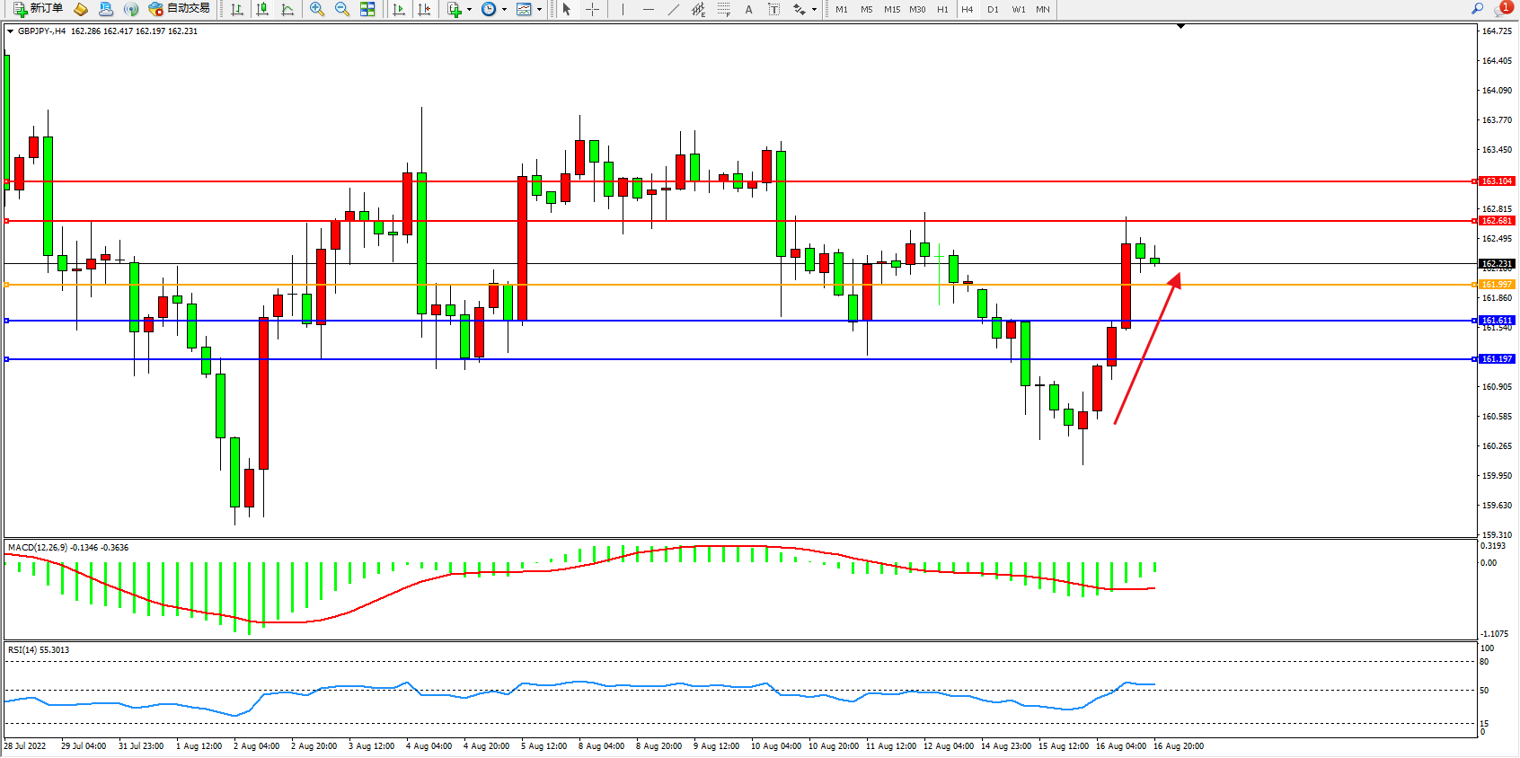 交易策略:161.997上方看涨,目标162.681、163.104