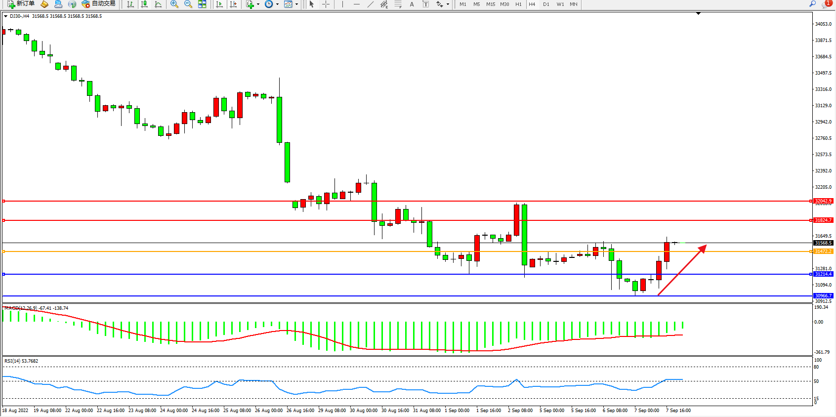 道琼斯指数DJ30——4小时K线图显示: