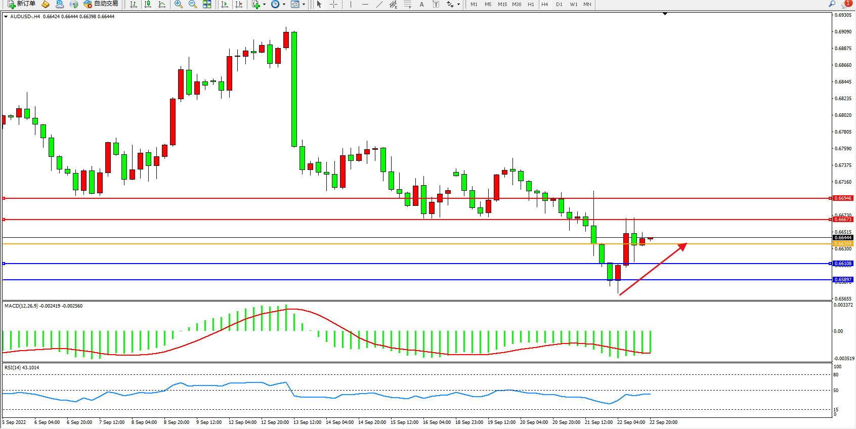 澳元美元AUDUSD——4小时K线图显示: