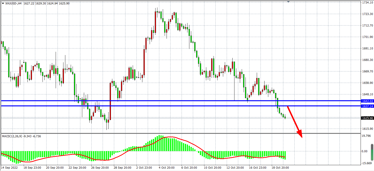 1小时图看,金价在跌破1642之后持续走弱,MACD在零轴之下呈持续放量状态,显示行情有进一步扩大下跌的需求,目前阻力已下移至1637附近,在1637之下继续看跌,下方目标1615-1620。