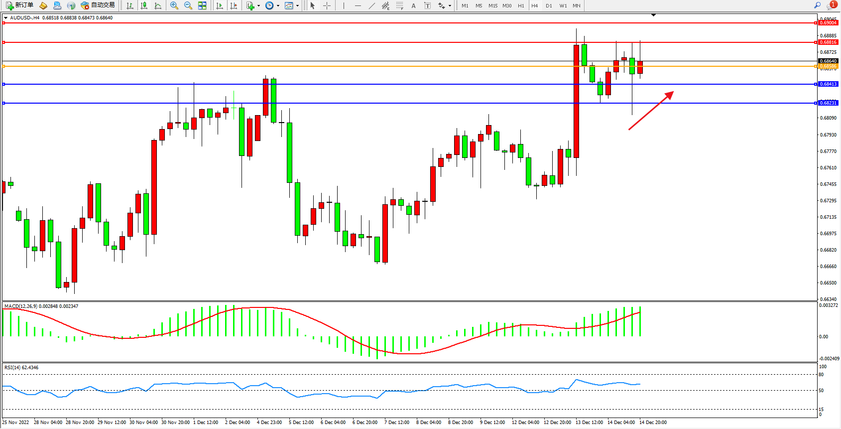 澳元美元AUDUSD——4小时K线图显示: