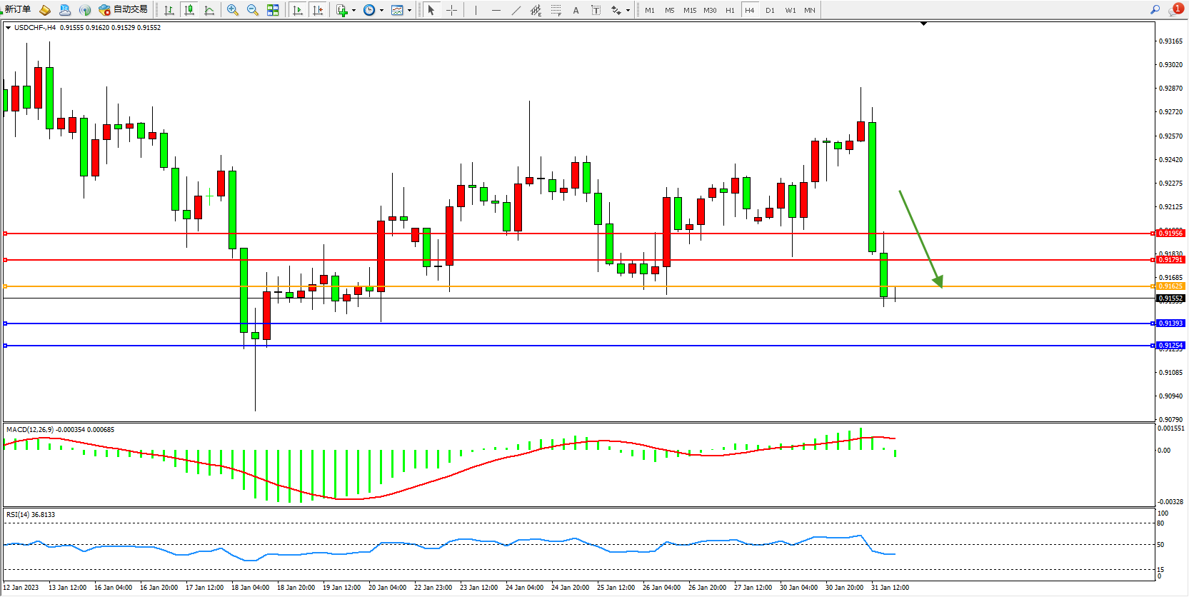 美元瑞郎USDCHF——4小时K线图显示:
