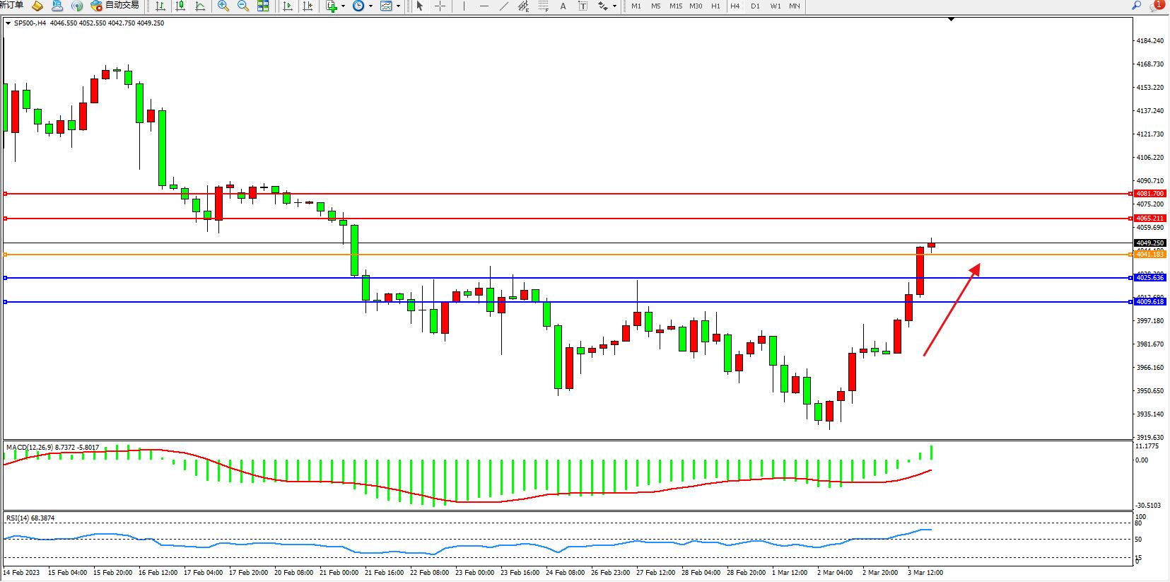 标普SP500——4小时K线图显示: