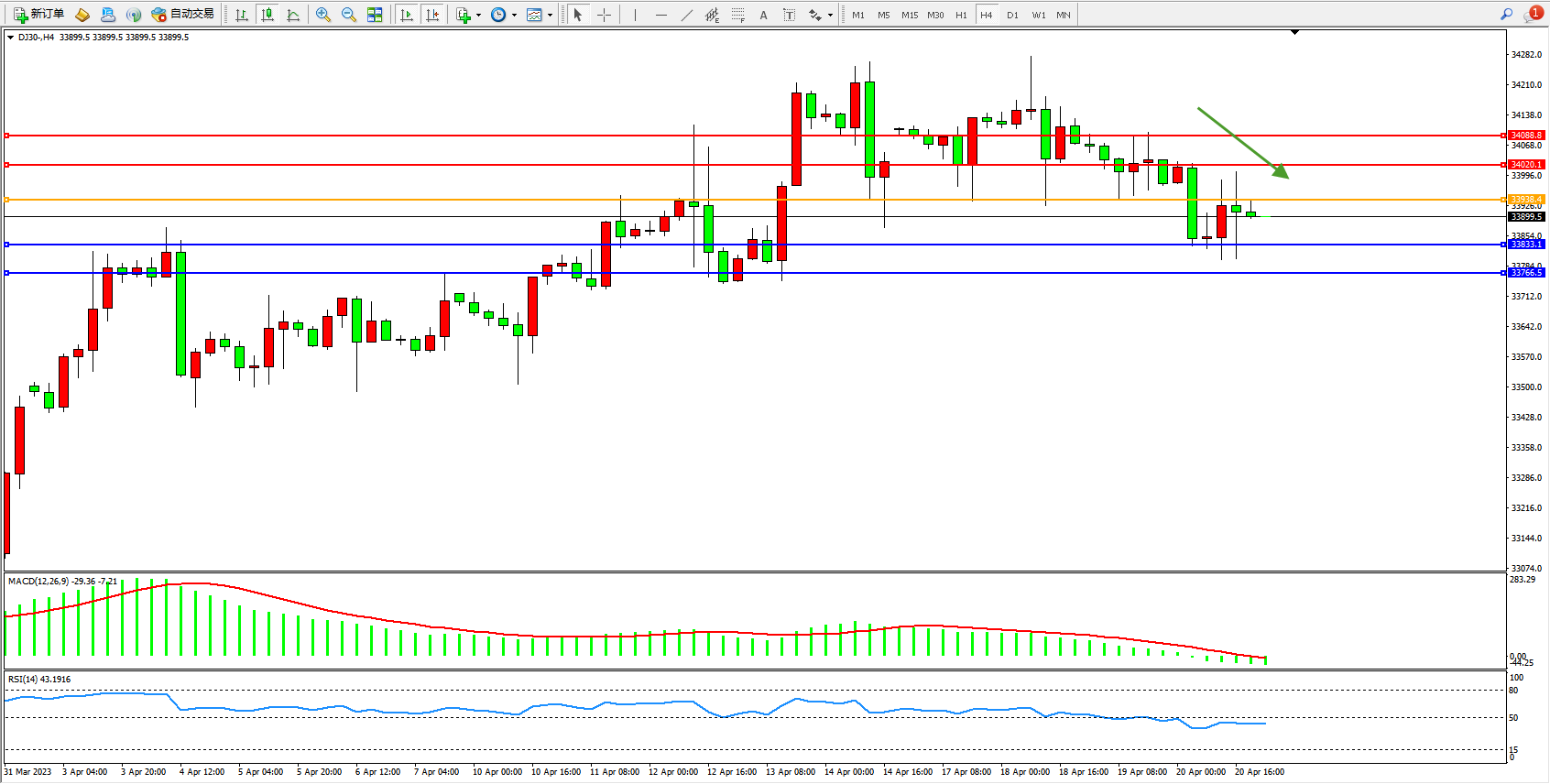 道琼斯指数DJ30——4小时K线图显示: