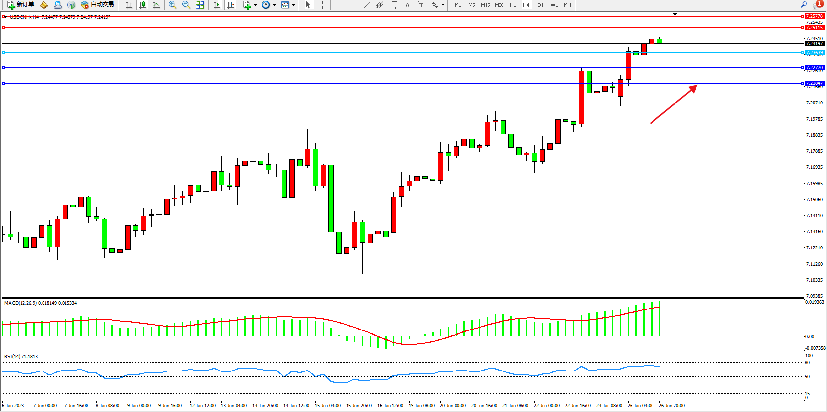 美元人民币USDCNH——4小时K线图显示: