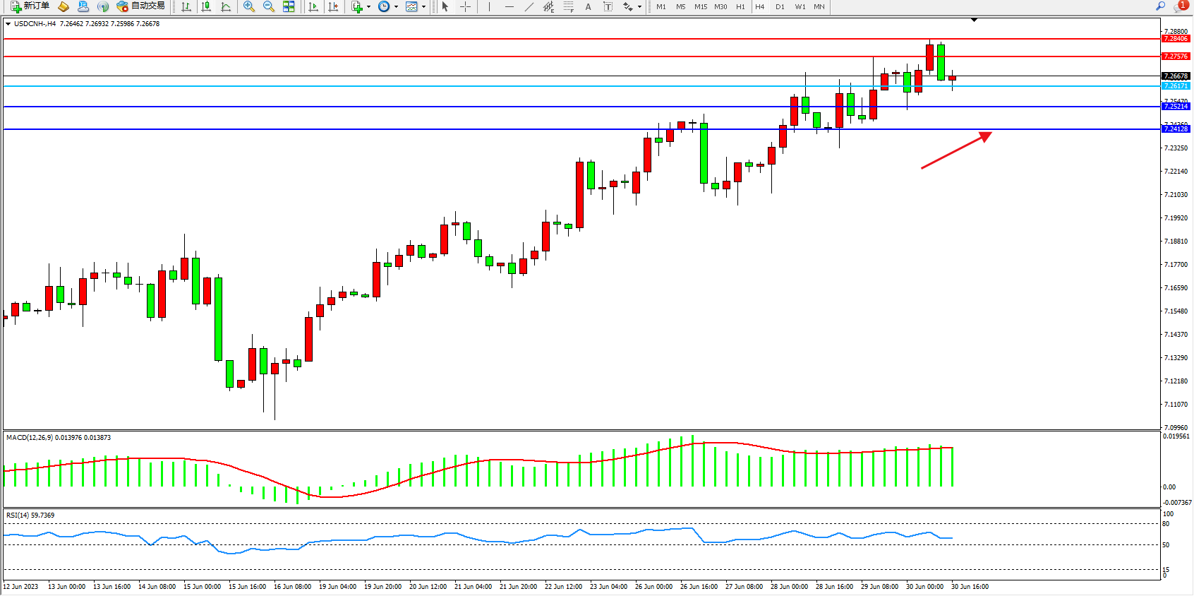 交易策略:7.26171上方看涨,目标7.27576  7.28406