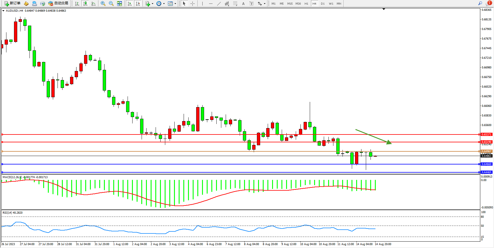 澳元美元AUDUSD——4小时K线图显示: