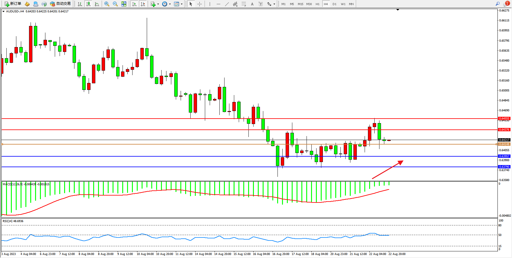 交易策略:0.64148上方看涨,目标0.64376 0.64555