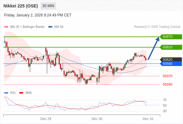 在 50560 之上,看涨,目标价位为 50810 ,然后为 50970 。