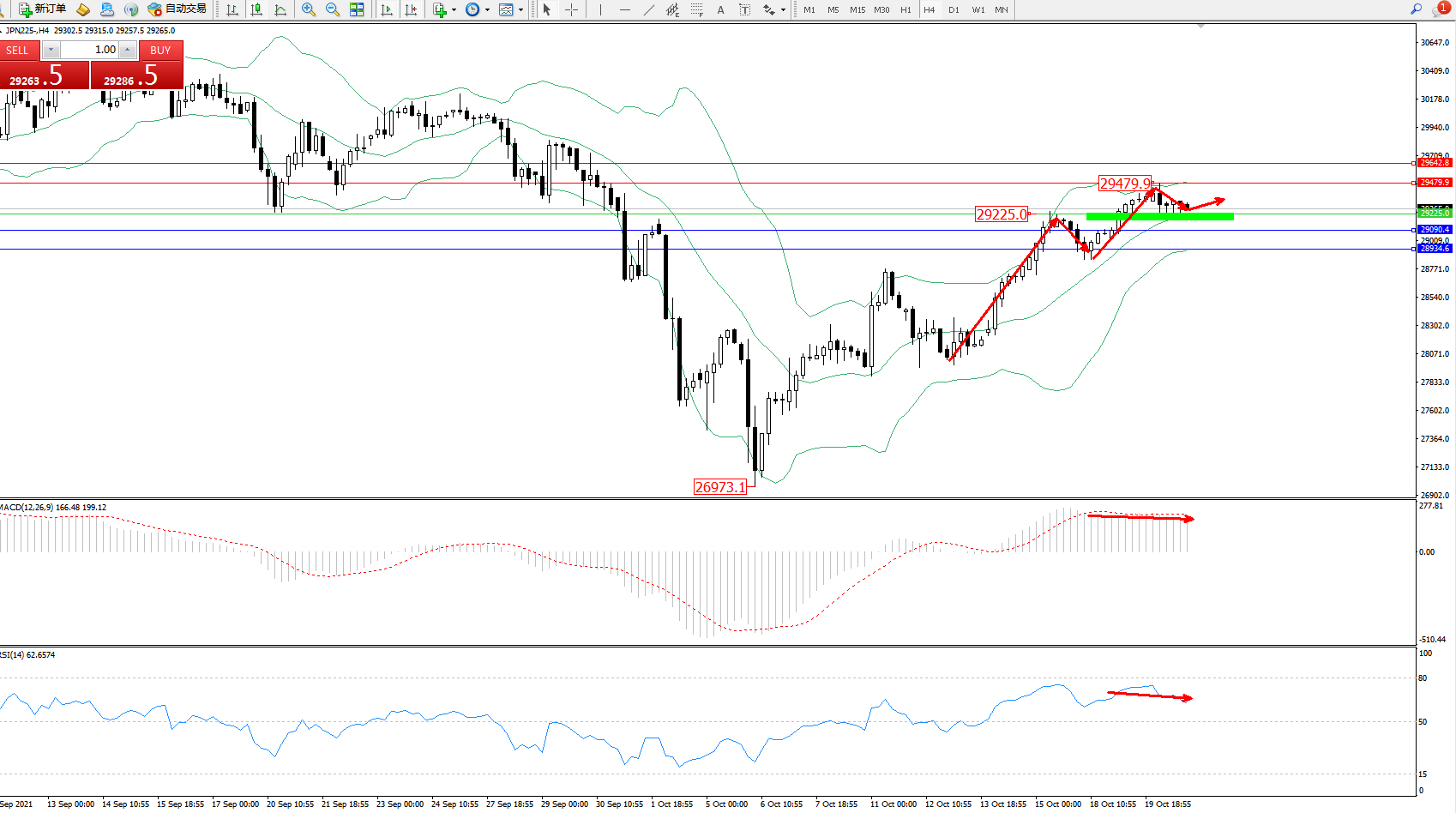 技术点评:多头动力延续布林带指标通道中上轨区间持续震荡上扬,高位抵达29479位置后开始整理,短期多头拉升动力开始发力,布林带指标呈收口走势持续平移中,MACD指标处于多头区域维持整理平移,RSI指标处于多头区域维持窄幅整理后有下移迹象;