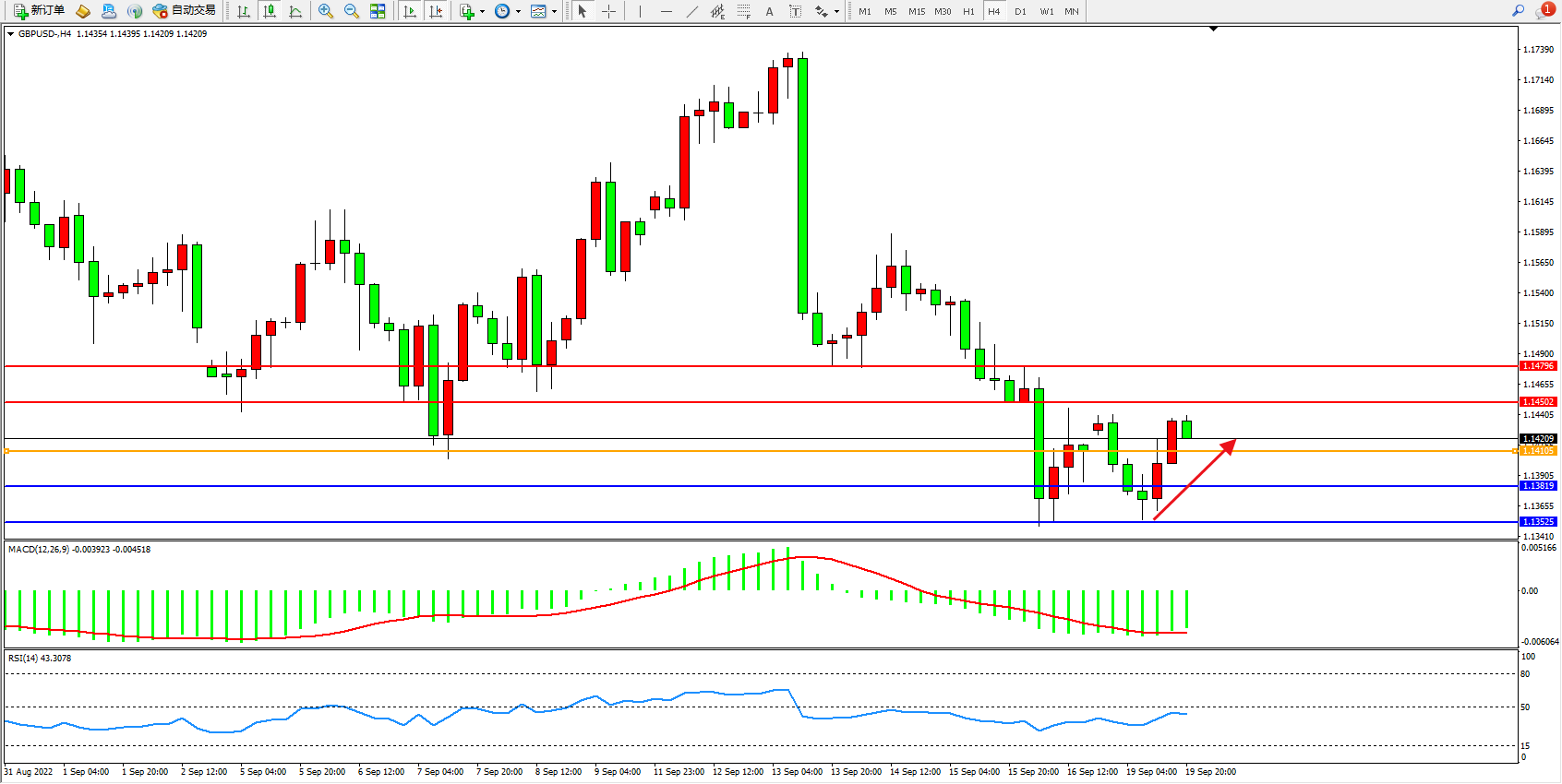 交易策略:1.14105上方看涨,目标1.14502、1.14796