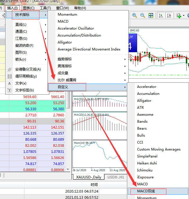 2.成功保存MACD双线指标后,登录MT4,点击插入菜单→【技术指标】→【自定义】→【MACD双线